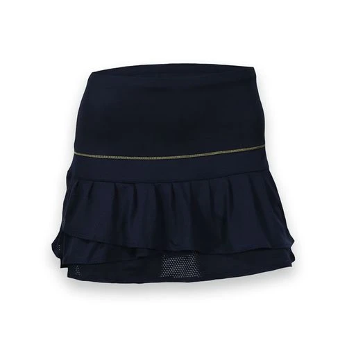 A combination of solid and pindot mesh fabrics add texutred and style to this attractive tennis skirt from Lucky in Love. Skirt features attached undershorts, a flat upper skirt with layers of mesh ruffles at the hem. Contrast topstitching adds a pop of color. Color: Midnight Blue Skirt Length: 13.5 Inches Fabric: 88% polyester/12% lycra Athletic Fit: More fitted, tapered to the body