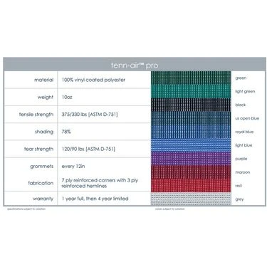 Another consideration is how dense a windscreen can be installed without risking fence damage from strong winds. Nine-foot windscreens are recommended for nearly all courts, and they should include anti-billow tabs as well as 6″ x 12″ openings placed 5′ to 10′ apart. Six-foot windscreens generally do not reduce wind as well as nine foot windscreens. They should only be used if the facilities are located near the water with very strong winds, which would destroy fences with 9′ windscreens attached.